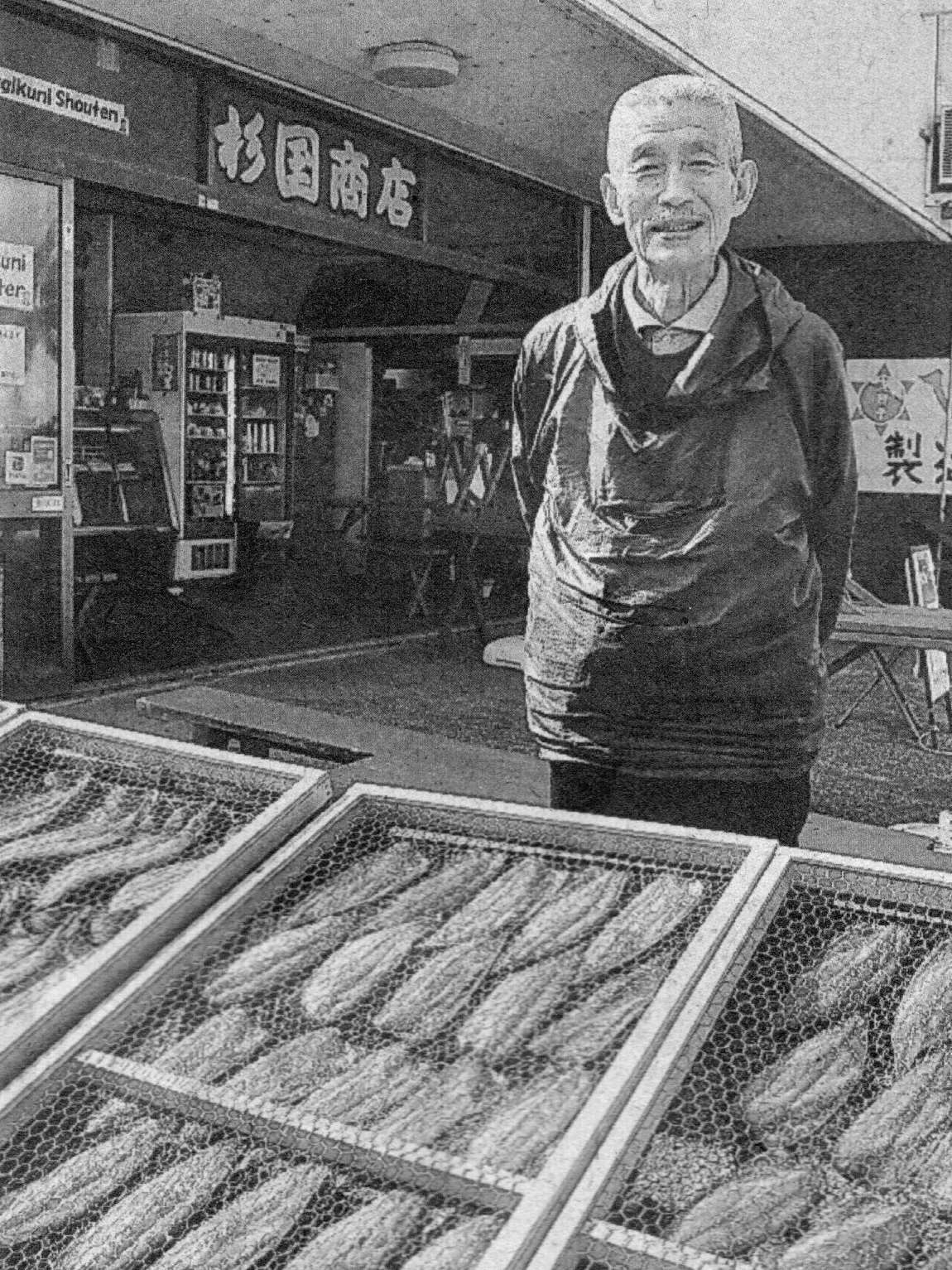 4代目店主の杉山国雄さん(75)の曽祖父が立ち上げたかつお節店が前身。3代目の父が1956年、九州でアジが豊漁だったことや、干物の土産品の人気が高まったことから干物店へ移行したという。