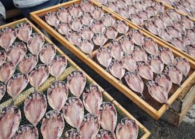 干物はアジ、さば、秋刀魚、カマス、金目、ふぐ。一部みりん干しもあり。